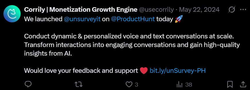 On May 22, 2024, Corrily's official Twitter account (@usecorrily) announced: 'We launched @unsurveyit on @ProductHunt today 🚀'